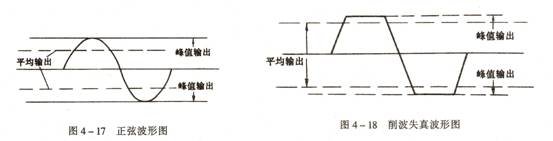 图4—17显示一台功率放大器正常工作时不失真输出的正弦波形,此时该信号的平均输出功率约为峰值输出功率的一半。图4—18是当功率放大器被过荷驱动出现削波失真的波形,此时平均输出功率将接近峰值输出功率的数值。图4—19显示功率放大器被过荷驱动达到饱和状态,正弦波输出信号变成了方波信号,此时的平均输出功率就等于峰值输出功率。由电工原理关于谐波分析的傅立叶级数理论可知,一个周期性的非正弦波信号是由频率从低至高排列的一连串正弦波信号所组成,分别称为基波、二次谐波(频率为基波的二倍)、三次谐波(频率为基波的三倍)……等。具体包含有哪些谐波成分则依非正弦波的波形不同而定。例如一个频率为1KHz的正弦波信号,在严重削波失真变得接近方波形状时,除保留1KHz的基波外,还会产生一连串奇次谐波,即3KHz、5KHz、7KHz.….·等谐波信号。正弦波被削波越严重,其产生的高次谐波成分越多。正是这些由削波失真而带来的高次谐波信号,对高音扬声器构成最大的威胁,被称为高音扬声器的头号“杀手”。这时乐音中低音与高音成分的分布比例已不再依照前述的音乐信号能量分布自然属性(大约10比1)的关系,而是高音分量被大大增强,导致高音扬声器有烧毁的危险。