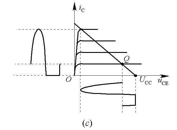 功率放大器一般是根据功放管工作点选择的不同进行分类的。有A类、B类及AB类功率放大器。当静态工作点Q设在负载线性段的中点,整个信号周期内都有电流IC通过时,如图2.1(a)所示,称为A类功放。若将静态工作点Q设在横轴上,则IC仅在半个信号周期内通过,其输出波形被削掉一半,如图2.1(b)所示,称为B类功放。若将静态工作点设在线性区的下部靠近截止区,则其IC的流通时间为多半个信号周期,输出波形被削掉一部分。如图2.1(c)所示,称为AB类功放。
