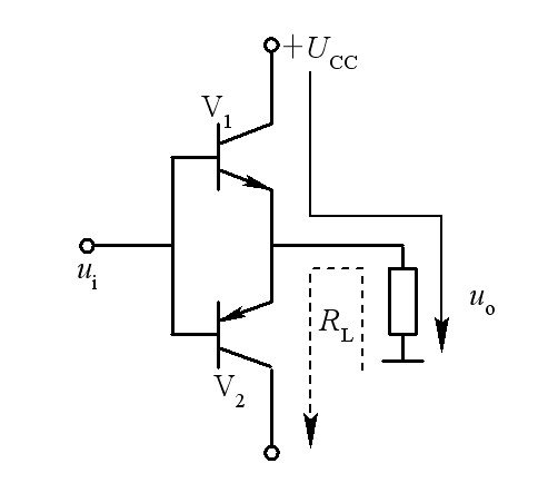 选用两个特性接近的管子,使之都工作在B类状态。一个在正弦信号的正半周工作,另一个在负半周工作,便可得到一个完整的正弦波形。图3.2为正半周时的工作情况。