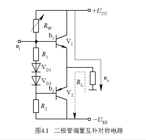 如果电路处在A类放大状态,则静态工作电流大,因而效率低。若用一个管子组成AB类或B类放大电路,就会出现严重的失真现象。B类互补对称功放,既可保持静态时功耗小,又可减小失真,如图3.1所示。