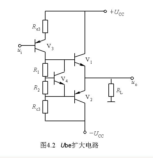 但上述偏置方法的偏置电压不易调整,而在图4.2所示电路中,设流入V4管的基极电流远小于流过R1、R2的电流,则可求出Uce4=UBE4(R1+R2)/R2。因此,利用V4管的UBE4基本为一固定值(0.6~0.7V),只要适当调节R1、R2的比值,就可改变V1、V2管的偏压值。这种方法常称为UBE扩大电路,在集成电路中经常用到。