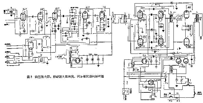 图3右边是终端放大器,和供给它直流电源的整流器。终端放大器各级都用推挽式线路。在输入变压器T5前面有一衰减器,在放大器机架上仍能调节音量。在终端放大器第一级2×6SJ7(Л7, Л8)和第二级2×6V6(Л9,Л10)电路中采取了对高音频的限制,以保证加负回授后工作的稳定性,负回授电压是由输出变压器初级经分压器接到第一级电子管的阴极电路,所加足够深的负反馈保证了放大器能够在负荷变动很大的情况下,输出电压只有极小变化。