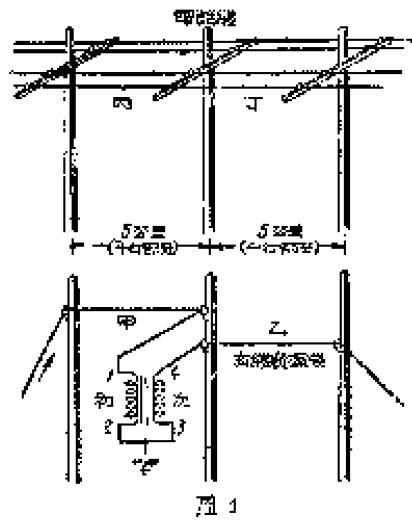 通过同一地区的有线广播输送线和长途电话传输线,如有一方面是用单线传输,二者之间就发生严重的串音现象。在广播的线路里,听得见长途电话;或在长途话路里,收到了广播节目。虽相隔数公里也不能避免。如果两方都用平衡的双馈电,中途各有适当的交叉,虽相隔约一公尺,串音也很轻微。所以解决单线输送有串音的最理想办法,是把它们都改成双线输送。但这样做所需财力物力很大,一般还不能够很快的做到。在上述情况下,我们建议用“电流交叉”的办法来减除串音。把单线上“电的”中部位置找出来,加入一个适当的变压器,使前后两段线上电流方向相反,数值相等,就可以完成“电流交叉”。例如一路有线广播单线有长十公里的一段和长途电话线平行。在这段线的中点(注意在线段的中点不一定是电的中部位置),加一初次级圈数适当的变压器如图1,使电流在变压器的左边导线甲上从左流到右,在右边导线乙上是从右流到左,而大小相等。设甲段在电话线的丙段感应电压为5伏;乙段在丁段所感应的电压极性相反而大小也是5伏,结果在这十公里的线段上,串音的电压相互抵消。实际上完全相消虽不能够做到,但串音程度是会减小很多的。