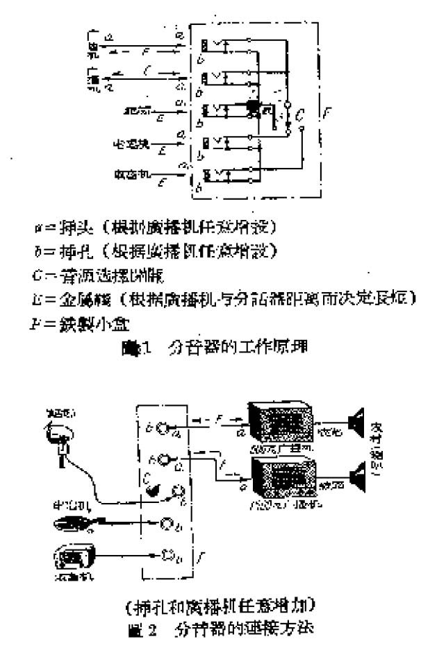 为了达到这个目的,我们可以加用一个“分音器”。它的作用原理如图1。使用方法如图2。看图自然明白,用不着多加解释。有这样的“分音器”,音源和播音机都可以任意增加,只要把音源选择开关的接触点和播音机的插孔相应的增加就行,确实很方便。