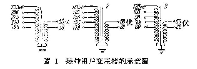 现在我们的乡村电话线路一般绝缘不很高,规定最高的线上电压不能超过240伏,所以240伏就是扩大机所要维持的输出电压。现在我们所用的喇叭有动圈式和舌簧式两种,根据实际经验对这两种喇叭所能输入的最高电压是30伏和50伏。这些喇叭都是直接接到用户线上的,所以用户线上的最高输入电压就是30伏和50伏。几种变压器的初级电压范围尽管不同,它们的次级应当不是30伏就是 50伏。也可以用具有30伏和50伏两个输出电压的次级。根据一般县到区和区到县的电话线的长度和镀锌铁线的降压情况,变压器的初级电压范围分0—255伏,0—180伏和0—120伏三种就可以了。抽头每种都是4个,隔15伏抽一个头调整也就够方便了(图1)