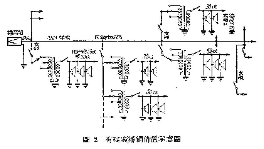 苏联的农庄用户比较集中,路线一远就分几次集中接转,接转前后,线上的电压并不相等。我们的农村相当分散,沿着一对县到区,或区到乡的电话线,到处都可能接上长短不同的用户线,所以最好是在240伏电线上又直接接许多240伏支线,再由支线上经变压器接到用户线。每一路支线加一个开关,由区镇电话局负责管,当这一路支线有故障或短路情形时就断开开关,保证不使别的支线受到影响;每一路用户线也接一个开关,由村干部负责管,当这一路用户线上有喇叭短路时就断开开关,保证不使同一支线上其他用户线受到影响(图2)。