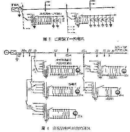 这样校准后就可以接喇叭,每接一个喇叭只拿下一个假负荷来(图4),可以保证每个喇叭有足够的音量,并使扩大机的负荷稳定。代替0.5瓦动圈式喇叭的假负荷电阻是302÷0.5=1800欧,代替0.3瓦舌簧式喇叭的大约是502÷0.3=9000欧。应当注意同一对用户线上,不要接两种式样的喇叭。此外,干线上的电压已经降低到30伏以下,就不要再接支线。用户变压器不能直接接到240伏干线上,以免影响通电话。