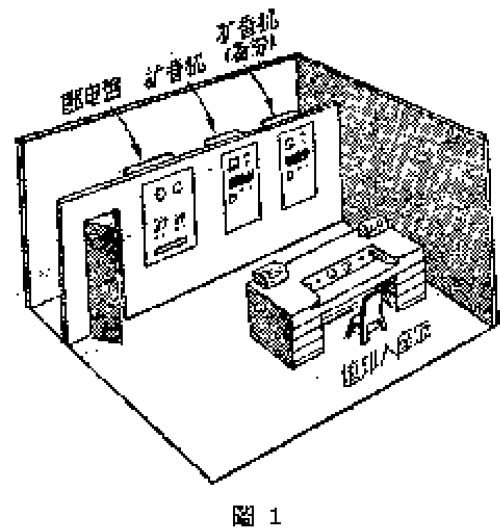 两部扩音机和一个配电板,摆起来地方不小,要占一个小房间,需要有人在这里值机,备有值班人的桌椅。值班桌上还可以放置两部收音机。有线广播站的机房就是这样布置的(图1):并排的从左到右分开放着配电盘、第一部扩音机和第二部扩音机,把它们的面板都嵌在一块木板壁上,木板壁的最左边要开一个小门,人可以进去检修机器。这样把小房间就隔成了两间。木板壁前就放置值班人的桌椅。