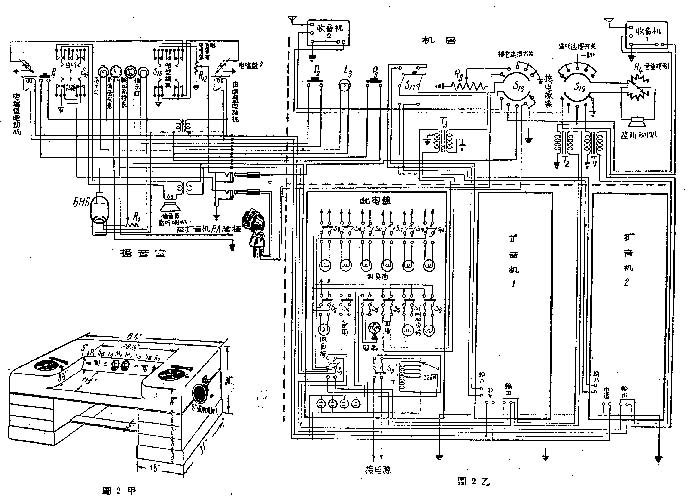 图2乙是一个播音站全部机线布线图。左边是播音桌上设备布线图,两个电唱盘一左一右放在桌面上,其余电表、开关插头等装在桌子中央斜面的横铁板上,话筒放在桌面上可以移动。图中右边上面是值机桌上设备接线图,两部收音机一左一右的放在桌面上,监听喇叭装在桌旁。其余的开关和变压器装在中央直放的铁板上;图中右边下面是配电盘和两部扩音机。