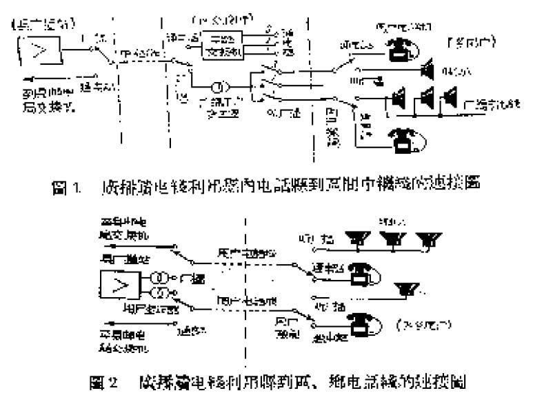 农村有线广播站,一般设在县人民委员会所在地,区设有县内电话交换机的,可利用县到区的中继线做广播馈电线,区到各乡村的用户线就作为广播用户线。没有安装电话的乡村,装置喇叭时,应当先架设一路广播用户线,引入附近区的电话交换所,在交换所装置双掷倒换开关和广播用户变压器,由电话交换机值班人民负责控制。在区没有装电话交换机只装有电话机的,可以利用县到区的电话用户线作为广播馈电线或用户线;附近没有电话的乡村装置喇叭时,需要先架设一路广播用户线,引到区电话用户处,装置倒换开关和广播用户变压器,开关由电话用户负责控制,这类电话用户最好是区或乡人民委员会。以上各种情况的连接方式分别示如图1和图2。