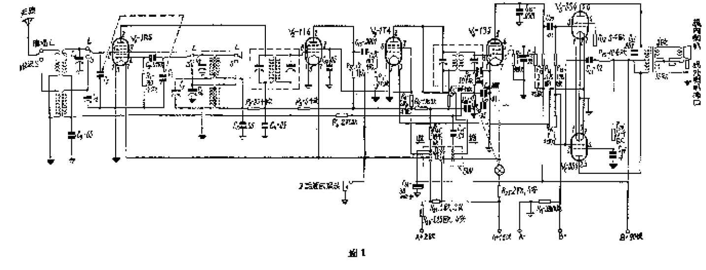 当话筒插头插入插口J时,中频放大管V3变成了前置放大级。四刀双掷开关SW的第1、2两刀在 “扩音”位置时,V3屏路里的中频变压器初级短路,同时串接入电阻R10,作为屏极负荷电阻,经过放大了的话筒音频电压,从这里经过电容器C14交连到音量控制器R25上,再按原有的音频放大情形放大,使喇叭发出充足的音量。图中R24、C25是一个退交连回路,可以消除电阻交连所引起的“汽艇声”。R9降低了V3的帘栅电压,使符合V3作电阻交连音频放大器时的运用情况。变频管V1和第一中放管V2的灯丝电源,在扩音时,被SW的第3刀切断。这样,既节省了甲电池的消耗,又保证在扩音时,不会同时收到广播。另外,干电收音机甲电池除用1.5伏电池作灯丝电源外,有时为了节约甲电池的消耗,改用2伏的蓄电池。但用2伏的蓄电池时,一定要串联降压电阻,把电压降到1.4伏,才不致损坏电子管。在这里开关SW的第4刀就起到这个作用。当用2伏蓄电池收音时,灯丝电流0.4安,流经R22(R21被短路)和R23,电压降到1.4伏;扩音时,V1、V2灯丝电源已被SW第3刀切断,电流减到0.3安,电压增高,故把R21串入,使仍旧保持1.4伏的电压。用2伏电源时,图中A+1.5伏电池接线柱空着不接;同样,用1.5伏时,A+2伏接线柱空着不接。