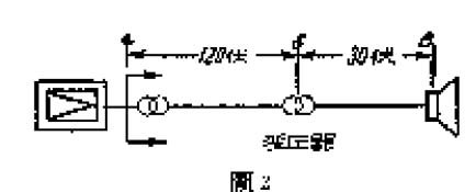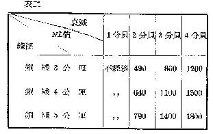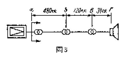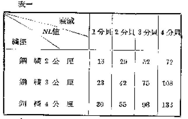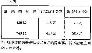 表三:是馈送线电压为120伏,在线路长度大于6千公尺时NL、∮、B之间的关系。上面三个表中所用的扬声器均为装在室内的纸盆型扬声器,若连接了反射型的高音扬声器,可用表四。