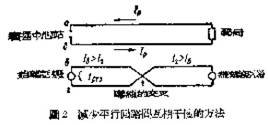 为了说明交叉的道理,我们可以假想整个回路分成了若干相等的段,每段上所产生的串音电流达到始端话机时的值为I1、I2、I3……等。因为沿线有电流损耗,所以离开始端愈远来的电流愈小,即I1>I2>I3……。流经电话机的总电流为:如Ipeз=I1+I2+I3+……。减小每个回路里两导线间的距离,并增加两回路间的距离,可以适当减低串音。但这样安排的几个同杆架设的回路,即使布线十分注意,也还有相当大的串音,所以需要做回路交叉。交叉就是把电话回路里两道线的位置在适当的地点对换(图2示全路只做了一次交叉的情形),如果我们就按交叉点来分段,即在第一个交叉以前是第一段,第一和第二两交叉点间的线段是第二段等,交叉的结果,相邻两段的串音电流方向相反,它们的总和应当是:Ipeз=I1-I2+I3-I4… …。
