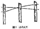 在已有的线路上实行混合挂线,常不能保持不超过上述长度误差的限度。但仍要把间隔比较均匀的列为一“区”,整个回路分为有不同“基本间隔”的“区”。按上述的办法分区以后,进一步要确定交叉“指数”。这“指数”表示出回路交叉的规律,指明在一个“区”的那些“基本间隔”上应进行交叉。交叉指数简单的只有一个数字。常用的是指数4,表示在每第四个基本间隔末进行交叉。几种简单指数合并起来,就成为复式交叉。例如1—4和1—2—4都是复式交叉。它的意义很容易了解。就拿1—4交叉指数来说,它表示先按指数1做交叉,再按指数4做交叉。因为在第5个木杆上,前后做两次交叉,就等于不做交叉,结果如图5所示。同理其他复式指数的交叉图均列如图5。