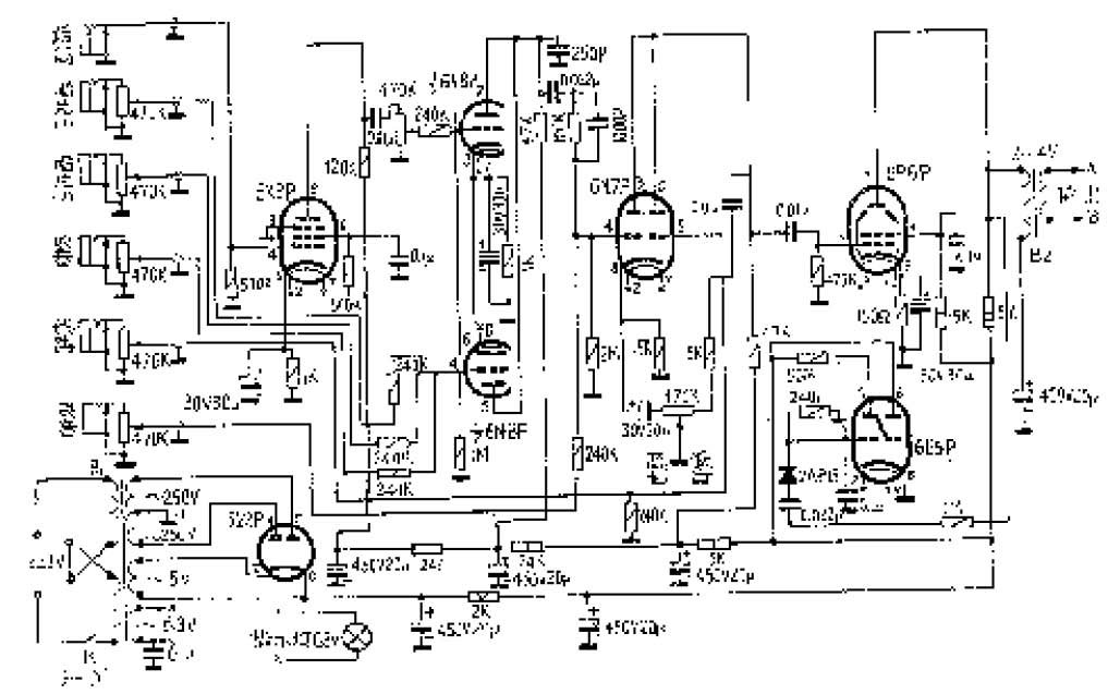 3.在保证得到所需要的电压增益的情况下,采取屏极混合输出的方法。这样,可以减少整机的电子管,从而可省去防止自激而采用的负反馈电路;也简化了级间耦合电路。