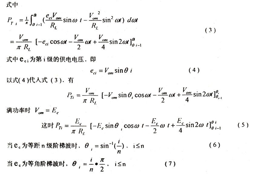 则式(1)中的被积函数即为零。也就是说,这时没有管耗,因而效率将达到100%,但式2是不可能实现的,实际上大功率管至少需要2V左右的管压降。再说,如果能使Ec完全跟随Vomsinωt,则供电电源本身就可以直接驱动负载,功放的效率问题就变成电源的效率问题。但是,令Ec分级逼近Vomsinωt则完全是可行的,并且不会额外地引进电源的效率问题。