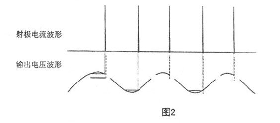 为了证实是否存在异常的电流通道,我们检测功率输出级的射极电流,发现在饱和状态下,确有异常现象,其波形如图l所示。图中饱和线以上的尖峰表明,在退出饱和的瞬间,出现一个远大于饱和电流的尖峰;而在0线上的尖峰则说明即使在功率管截止期间也有大的尖峰电流发生。从相位上看,后者显然对应于互补对的另一只管退出饱和的时间。由此可见,功率互补对在退出饱和的瞬间,出现了全导通现象。在负载开路时也有这种全导通现象发生,其波形如图2所示。由此可见,正是由于输出互补对管的全导通,才导致短路保护动作和异常温升。
