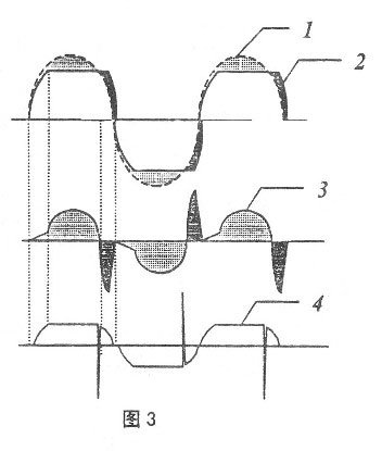以正弦激励乙类推挽为例,功放进入饱和时(通常是末前级—推动级率先饱和),输出互补对的工作波形将如图3所示。图中曲线1为正弦激励信号。为便于讨论,首先假设大环路负反馈端尚未闭合,则由于基区电荷效应,放大管从饱和状态退出时,将会发生较为显著的时延,见图3中的曲线2。由此将形成误差电压3。闭环后,由于反馈调节作用,输出曲线2将逼近曲线1(饱和部分除外),结果加到互补对上的误差电压将如曲线4(其平坦的顶部是由于前级饱和形成的)。显然,误差电压4中的尖峰必将驱使互补对的另一端导通。本来该尖峰应使本端截止,但由于基区电荷效应而来不及截止,于是形成了互补对管全导通现象(在当前条件下,惟其如此调节才会有效)。当负载开路时,末前级仍然会饱和,所以仍然会在正半周出现负尖峰激励,而负半周会出现正尖峰激励。