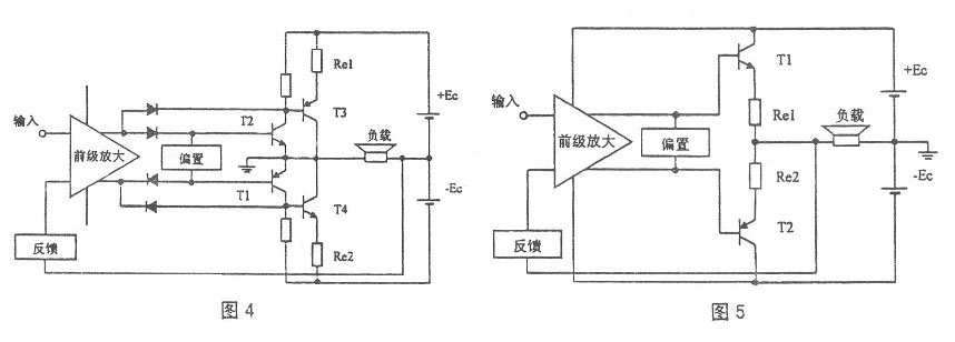 例如,图5所示的输出级的饱和特性就会比图4好。这种电路形式是目前功放的主流放大电路,主要是由于它的输出对管的基极交流等电位,亦即驱动信号相同;而图4中的输出对管的基极驱动信号并不相同,它可能存在着由推动级传过来的全导通信号,故而会进入全导通状态。(这种电路的一个最大的优点是,由于功率管集电极全部接地,所以无须在功率管和散热器之间加绝缘片,这样会更有利于散热)。但是,如果图5中前级放大的供电比输出级供电高,驱动信号足以使输出管集电结正偏而进入饱和状态,则该电路亦会出现全导通现象。