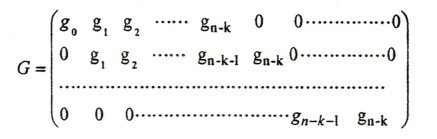 其中g(x)=g0+glX+…+gn-kxn-k。通常,系统码在实用中更为方便,而由上得到的G却不一定满足要求。方法之一是对G施以初等变换,使之可表为下述矩阵形式: