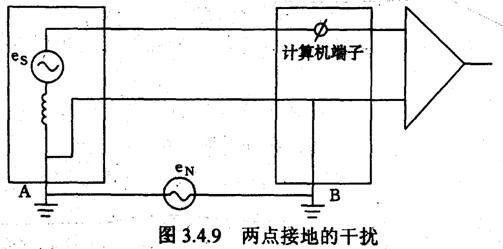 ④由于接地不合理,例如在信号线的两端接地,会因为地电位差而加入一较大的干扰,如图 3.4.9 所示。信号线的两端同时接地,这样,如果 A 、 B 两点的距离较远,则可能会有较大的电位差 eN ,这个电位差可能会在 A · B 两端之间的信号线上产生一个很大的环流。