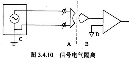 ③还有一种隔离是将信号源同计算机在电气上进行隔离,这样,会大大地减小共模干扰对计算机造成的危害。如图 3 . 4 . 10 所示。图 3 . 4 . 10 表示用隔离放大器将信号的输入端子与计算机部分完全隔离(有的系统中采用隔离变压器,或继电器等方式隔离,对开关量则可以采用光电器件,或继电器进行隔离)。这样,由于 C 和 D 之间地电位不同所产生的干扰信号形不成回路,抑制了干扰的危害。