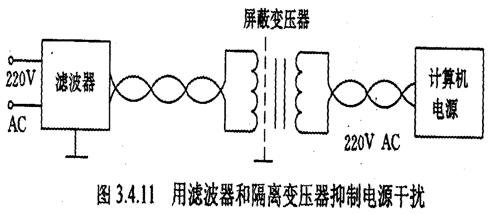 为了防止供电线路上引入共模高频干扰信号,可以在供电线路上设隔离变压器进行干扰隔离,如图 3 . 4.11 所示。