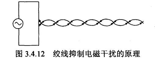 图 3 .4 .12 中,每个小绞纽环中会通过交变的磁通,而这些变化磁通会在周围的导体中产生电动势,它由电磁通感应定律决定(如图中导线中的箭头所示)。从图中可以看出,相邻绞纽环中在同一导体上产生的电动势方向相反,相互抵消,这对电磁干扰起到较好的抑制作用。