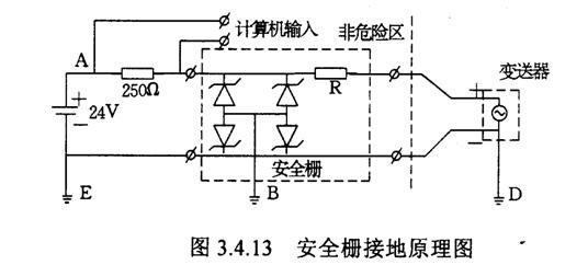 ·安全栅的接地:我们回过头来再看图3.4.13所示的安全栅线路图。从图中可以看出有三个接地点:B,E,D,通常B和E两点都在计算机这一侧。可以连在一起,形成一点接地。而D点是变送器外壳在现场的接地,若现场和控制室两接地点间有电位差存在,那么, D点和E点的电位就不同了。假设我们以E作为参考点,假定是D点出现10V的电势,此时,A点和E点的电位仍为24V,那么A和D间就可能有34V的电位差了,己超过安全极限电位差,但齐纳管不会被击穿,因为A和E间的电位差没变,因而起不到保护作用。这时如果不小心现场的信号线碰到外壳上,就可能引起火花,可能会点燃周围的可燃性气体,这样的系统也就不具备本安性能了。所以,在涉及到安全栅的接地系统设计与实施时,一定要保证D点和B(E)点的电位近似相等。在具体实践中可以用以下方法解决此问题:用一根较粗的导线将D点与B点连接起来,来保证D点与B点的电位比较接近。另一种就是利用统一的接地网,将它们分别接到接地网上,这样,如果接地网的本身电阻很少,再用较好的连接,也能保证D点和B点的电位近似相等。但注意,此接地一定不要与上面几种接地发生冲突。