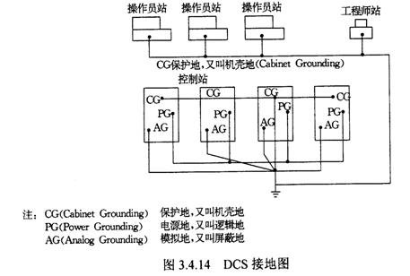 DCS本身是由多台设备组成的,除了控制站以外,还包括很多外设,而且数据也不止一台,这就涉及到了多台设备,多种接地的问题。此外,一般的DCS的供电是各站(控制站,操作站等)用专门一条线单独供电,即彼此之间不相互供电。图3.4.14是一种常用的多站接地图。