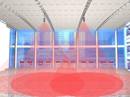 经过反复的计算机模拟和比较,决定选用2只DSP3012号角垂直吊装在大厅上空(如图三)来解决问题。
