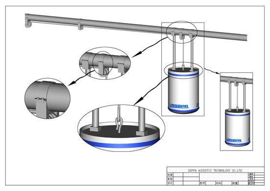 为了使吊装的号角同环境相协调,把号角藏在特制的声篮中。声篮的外观同吊装在大厅的照明灯具相似。详见图六。