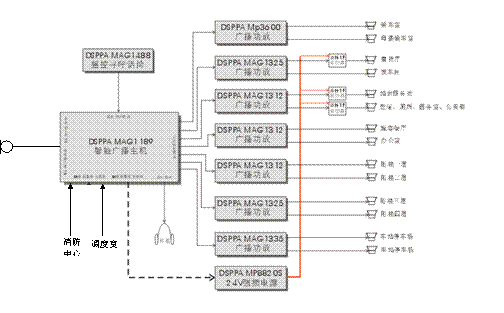 根据先进性、可靠性和甲方对系统功能的要求,应选用智能型的并具有3C认证的品种。据此选定迪士普的MAG智能系列,包括主机MAG1189、功放MAG1300系列、远程分区寻呼器MAG1488等。