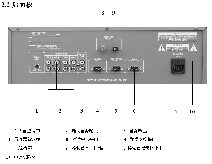 4.2.6 可增加电话接口设备、主备切换器等设备。增加电话接口设备后,可进行电话广播;目前为止,功率放大器是系统可靠运行的薄弱环节,增加主备切换器及备用功率放大器,可提高系统运行的可靠性。用户需要增加其它功能,也可参阅迪士普相关产品的资料。