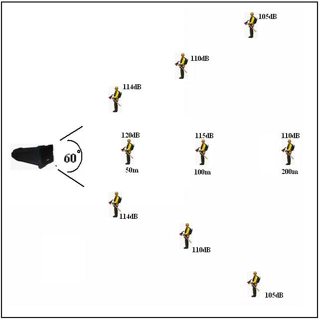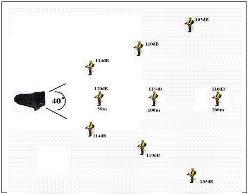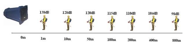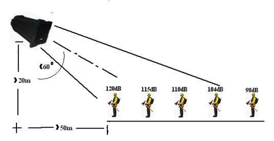 在这里需注意一点,请不要在距DSP-3012扬声器50m以内听音,此时声压有可能达到120dB以上,120dB的声压已是人耳痛域,人耳会将超过120dB的声音误认为失真,分辨率大大降低,而且大声压会损伤人耳。故请切记要将此扬声器挂高到20m以上。