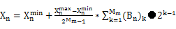 下面介绍一下使用最广的二值编码。二值编码即采用二进制编码的原则,将染色体二进制位表示为最大化函数f(x),其中x={X1,X2,…Xn},Xn定义于区间[Xnmin,Xnmax]。将变量Xm数字化为长度为Mm的二进制代码串Bm:B1,B2,…![]()