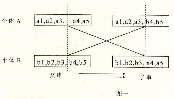 2)没定配对个体的交叉点,并对这些点前后的配对个体的部分结构或基因进行相互交 换。交叉的方式有多种,常见的有一点交叉,二点交叉,多点交叉,一致交叉等。下面以一点交叉为例,交叉方式如图一。