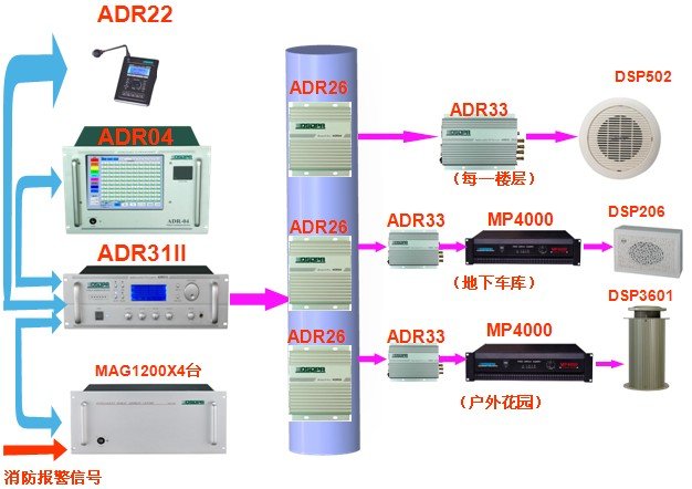 (1)ADR31可寻址广播控制器:可控制的分区数多达1000个;可连接远程寻呼器进行分区寻呼;具有分区强插报警功能。