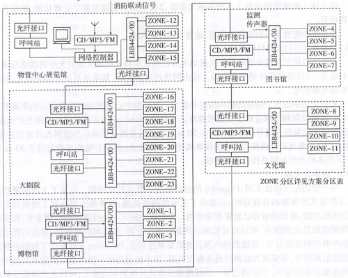 该系统有23个扬声器分区,由网络控制器、基本呼叫站、呼叫站键盘、光纤接口、数字口信录音记忆体、功率放大器、各种音乐源、扬声器和专用连接电缆等构成。设备清单见表2。